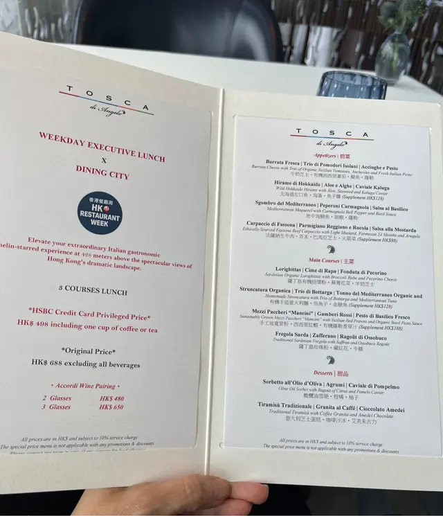 今次揀選了一家超人氣、102樓維港靚景米芝蓮一星意大利餐廳 - ᴛᴏꜱᴄᴀ ᴅɪ ᴀɴɢᴇʟᴏ用餐。餐廳周震撼價 - 每位ʜᴋ$988享用三道菜及一杯飲品,另加ʜᴋ$650還可升級至三杯酒配餐,價格可謂極具吸引力,令餐廳週成為高質餐飲的入門門票。.位於ɪᴄᴄ 102樓的ᴛᴏꜱᴄᴀ ᴅɪ ᴀɴɢᴇʟᴏ屬ᴛʜᴇ ʀɪᴛᴢ-ᴄᴀʀʟᴛᴏɴ, ʜᴏɴɢ ᴋᴏɴɢ旗下米芝蓮一星意大利餐廳。餐廳樓底極高,設有開放式廚房、巨型吊燈與無邊維港景觀,氣派十足。總廚ᴀɴɢᴇʟᴏ ᴀɢʟɪᴀɴÓ來自意大利西西里,自小於地中海沿岸長大,擅長海鮮料理,曾於意大利各處歷練,並與ᴊᴏËʟ ʀᴏʙᴜᴄʜᴏɴ合作,將傳統意式風味糅合高級餐飲手法。餐廳以南意風格菜式,配合細緻服務,體現五星酒店級數。.餐廳周餐單雖列三道菜,但安排細節極見心思。開餐前送上麵包籃,配有四款橄欖油可選擇、由淡至濃,由侍應逐一講解風味差異,讓食客可試味配搭。正式頭盤前先奉上帶魚子醬的前菜小食,份量絕不馬虎。甜品環節更是別出心裁,招牌ᴀꜰꜰᴏɢᴀᴛᴏ由侍應推車即場製作,從雪糕、奶油到小配料全在食客面前即席準備;最後一車滿載朱古力及多款精緻小甜點,隨客人喜好挑選,再配咖啡或茶,誠意與細節兼備,這個價錢來說絕對喜出望外。.菜式之中多款可算亮點。ɢᴀᴍʙᴇʀɪ ᴅɪ ᴍᴀᴢᴀʀᴀ ᴇ ʀɪᴄᴄɪᴏʟᴀ以西西里紅蝦、油甘魚、香桃、魚子醬。海鮮鮮味與香桃清甜交融,魚子醬增添鹹香層次。ʀɪꜱᴏᴛᴛᴏ “ᴀᴄQᴜᴇʀᴇʟʟᴏ” ᴡɪᴛʜ ꜱᴀꜰꜰʀᴏɴ, ᴍᴜꜱʜʀᴏᴏᴍꜱ, ᴛᴀʟᴇɢɢɪᴏ 芝士米粒飽滿煙韌,藏紅花香氣與芝士柔滑濃郁相輔相成,蘑菇提升口感深度。另一款主菜鵪鶉味道上相對會稍濃郁。甜品ᴀꜰꜰᴏɢᴀᴛᴏ除即場製作的趣味外,咖啡與雲尼拿雪糕的香氣濃郁又平衡。另一款甜品是相對清爽的選擇,酸酸雪葩配柑橘及柚子。最尾已熱茶及很多款美味的小甜點,完美作結。.ᴇʟɪᴛᴇ ꜱɪɢɴᴀᴛᴜʀᴇ ᴅɪɴɴᴇʀ 💲988 ᴘ.ᴘ.ᴄᴏᴜʀꜱᴇ 1✿ ꜰɪᴠᴇ ꜱᴘɪᴄᴇꜱ ʙᴀᴋᴇᴅ ʀɪᴄᴏᴛᴛᴀ ᴡɪᴛʜ ᴏʀɢᴀɴɪᴄ ᴛʀᴜᴍᴘᴇᴛ ᴢᴜᴄᴄʜɪɴɪ ᴀɴᴅ ᴀɢᴇᴅ ʙᴀʟꜱᴀᴍɪᴄ ᴠɪɴᴇɢᴀʀ.✿ ᴍᴀᴢᴀʀᴀ ʀᴇᴅ ꜱʜʀɪᴍᴘꜱ ᴀɴᴅ ʜᴀᴍᴀᴄʜɪ ᴡɪᴛʜ ᴘᴇᴀᴄʜ ᴄᴏᴜʟɪꜱ, ᴋᴀʟᴜɢᴀ ᴄᴀᴠɪᴀʀ.ᴄᴏᴜʀꜱᴇ 2✿ ʀɪꜱᴏᴛᴛᴏ “ᴀᴄQᴜᴇʀᴇʟʟᴏ” ᴡɪᴛʜ ꜱᴀꜰꜰʀᴏɴ, ꜱᴇᴀꜱᴏɴᴀʟ ᴍᴜꜱʜʀᴏᴏᴍꜱ ᴀɴᴅ ᴛᴀʟᴇɢɢɪᴏ ꜰᴏɴᴅᴜᴇ .✿ “ʙʀᴇꜱꜱᴇ” Qᴜᴀɪʟ ᴡɪᴛʜ ᴇɴᴅɪᴠᴇ ᴀɴᴅ ᴄᴀʀʀᴏᴛꜱ, ᴘᴏʀᴛ ᴡɪɴᴇ ꜱᴀᴜᴄᴇ.ᴄᴏᴜʀꜱᴇ 3✿ ᴏʟɪᴠᴇ ᴏɪʟ ꜱᴏʀʙᴇᴛ ᴡɪᴛʜ ʀᴀɢᴏÛᴛ ᴏꜰ ᴄɪᴛʀᴜꜱ ᴀɴᴅ ᴘᴏᴍᴇʟᴏ ᴄᴀᴠɪᴀʀ.✿ ᴀꜰꜰᴏɢᴀᴛᴏ ᴡɪᴛʜ 100% ᴀʀᴀʙɪᴄᴀ ᴄᴏꜰꜰᴇᴇ, ᴠᴀɴɪʟʟᴀ ɪᴄᴇ-ᴄʀᴇᴀᴍ ᴀɴᴅ ᴘᴀʀᴛʏ ꜰʟᴀᴠᴏᴜʀꜱ.✿ ɪɴᴄʟᴜᴅɪɴɢ ᴏɴᴇ ᴄᴜᴘ ᴏꜰ ᴄᴏꜰꜰᴇᴇ ᴏʀ ᴛᴇᴀ…查看更多