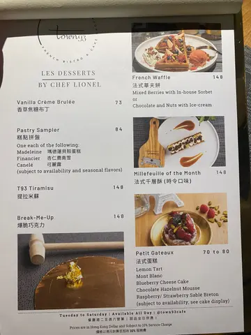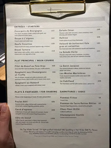 very attractive weekday set lunch a French 3 course lunch for $288 in Central!!! Do remember to save room for dessert.Superb coffee, the pastries or dessert are worthy of an afternoon tea drop by.The steak tartare is excellent, I am not a fan of truffles, so i had them hold the truffles, but if truffles is your thing, you will enjoy it. Had Bouchot mussels before, very well done, and I am not sharing it. Do try the mussels in white wine sauce.The French Onion soup is really good, made with the oxtail.The Lobster spaghetti is evil, you are not going to regret it.my dessert list: lemon tart. millefeuille, strawberry sable, mont blanc. in order.For Hong Kong standards, this place is really great value for money. It is a hidden gem of Hong Kong.…查看更多
