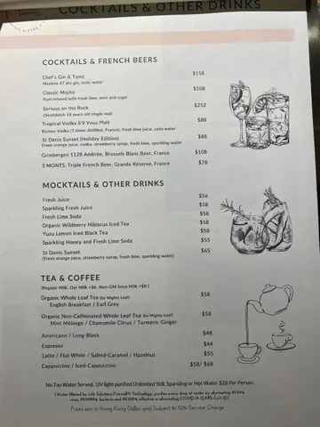 Avoid avoid avoid ! Prepared to be ripped off I was looking forward to trying this place as I was attracted to the signboards down below. I thought it would be a nice French Bistro serving hearty food. Instead of a relaxing cafe, as it’s decor leads you to believe it tries to be something it isn’t. A wanna be fine dining restaurant…When asked if we would like any water we both said warm water and the server immediately advised us this would cost $28 a glass ! So my photos say it all, it charges $288 for set lunch and if you want to upgrade to steak flank they will charge an extra $70, if you want to upgrade your dessert from a tiramisu they will charge you an extra $42. I understand the odd $20 extra but I can go buy another slice of cake and coffee for that extra cost elsewhere ! Apologies as I didn’t take a photo of the menu. Appetizers were soup / salad and poached egg / and for the other main course choices were a cheesy pasta and a grilled salmon with salad which both sounded unappealing. As we upgraded to the measly steak flank paying and extra $70 there were no fries or mash!!! And only 3 little tiny eggplants (not even rib eye or sirloin btw)the set lunch cost us $358+10% service charge. For $400 set lunch I expect better service and better /bigger portions !!!And we didn’t even get any drinks…. Not even any tap water as we would have been charged $30 including service charge! $400 Does not include any drinks what so ever not even TAPWATER!!!!Unfortunately I will not be going again to get ripped off. Location is great but other than that nothing else stands out for this place …查看更多