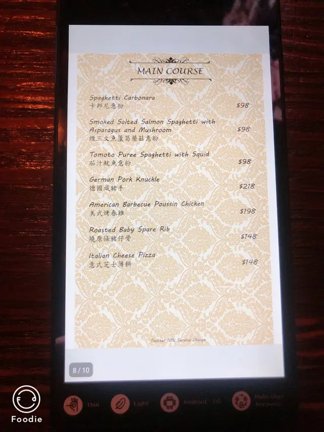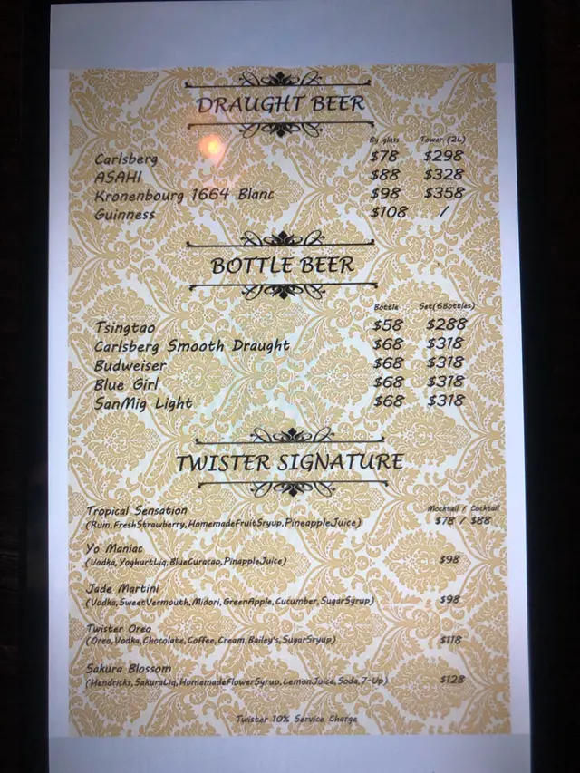 一間好有氣氛嘅bar, 一邊可以唱k, 一邊可以射鏢, 但我太肚餓, 乖乖坐埋一邊吃東西, 去bar食野其實好少人會咁做, 因為落bar通常都係想同friend吹下水飲下酒, 一般bar嘅野食, 來來去去都係現成買黎炸嘅, 但Twister menu就有好多選擇, 今次就揀左清酒冰魷魚($98), 魷魚鮮甜, 配日式芥辣很好味, 差d就想叫多一份, 另外有台灣香腸拼薯條($78), 香腸上有調味料, 吃唔出係咩味, 但配酒一流, 之後有燒原條豬仔骨 ($148), 又係有一堆薯角, 其實味道係幾好, 個人口味, 我鍾意食d可以"骨肉分離"的, 但我男朋友喜歡這種有咬口的, 有咬口得黎, 又唔會太過乾, 所以呢個啱佢, 可惜環境太黑, 拍出黎個樣唔係咁靚仔, 所以唔放相了最後忍唔住, 叫埋呢個醉香豬手($208), 應該叫酒浸豬手, 因為酒味超濃~ 幾正~當日得個Manager,Bar要做埋樓面個份,兩位都好nice,不過Manager忙住要應酬,Bar可憐少少要走來走去,所以都唔太敢麻煩佢地,但Bar仍然抽到時間幾忙都好,都會黎問下我地野食如何,服務一流!其實原先叫了兩杯cocktail,味道一般,太甜及飲得出好有syrup味道..同bar傾後原來這不是他的真功夫,我地邀請他發板,再做兩杯屬於他的cocktail, 他按我們原先order的分析我們的口味,再調了兩杯出來,果然係有d料子,兩杯的口味都好有層次,跟原先的是兩回事,老實說,如果是頭一轉的,我估我下次黎,都係叫返啤酒算,但後尾兩杯,是值得為cocktail而再來,希望下次可以見到有全新的cocktail menu~!…查看更多