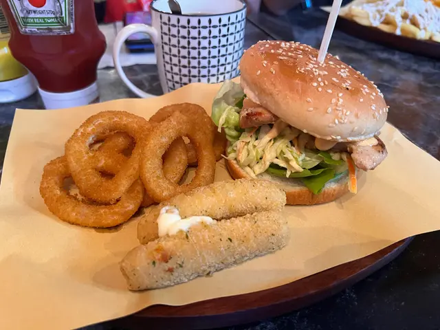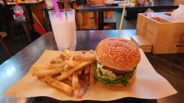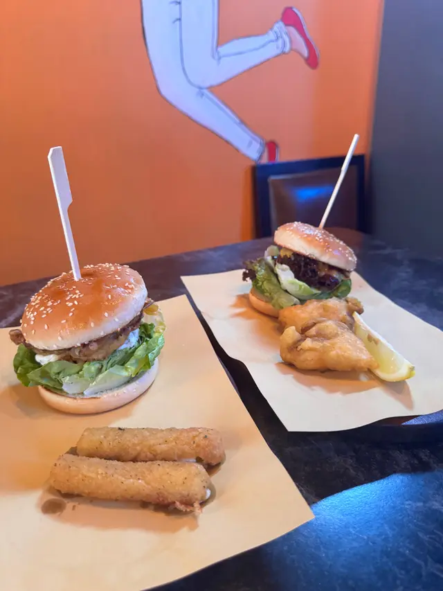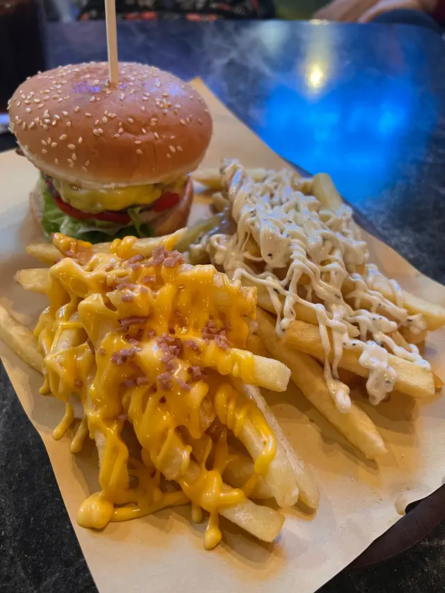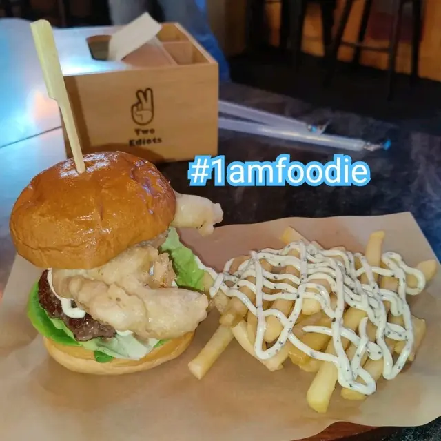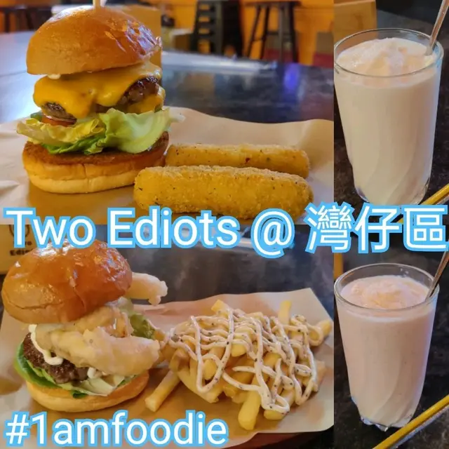 平時喺灣仔,好少會去到謝斐道果邊搵食,今次朋友介紹話Two Ediots抵食又好食,咁我同👦🏻都鍾意食burger,就一於試吓啦!Burger最平$48,我哋揀咗招牌Ediot(煙肉牛肉漢堡)同埋Dr. Hen(板燒雞堡)。包好軟熟,漢堡牛肉同雞扒都厚肉又夠juicy,番茄同生菜好新鮮。個醬汁係自家製,整體味道好夾。每個漢堡最多可以加錢跟2個小食同1個飲品,我哋就加咗黑松露薯條、芝士薯條、炸洋蔥圈同芝士條。大堆薯條,好好食,兩款醬都好好味,亦好generous比好多醬汁。不過黑松露味就唔算重。洋蔥圈正常發揮,芝士條相對就遜色啲,唔試都冇咩損失。另外仲有Pasta,眼見都唔少人冇食burger,係食Pasta,似乎都值得一試。另外,朋友仲特別推介1500-1900後薯條同雞翼$50任食,叫一杯飲品就可以,下次一定要食。…查看更多