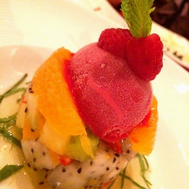 Twyst是位於上環的一間樓上意大利餐廳, 有酒店西餐的質素, 但價錢就比起來較平易近人, 所以成為了我的心水之一。一坐低便奉上canapes,Parma ham哈蜜瓜麵包同吞拿魚麵包之後Welcome bread的質素頗高,夠香軟,而配包的蕃茄粒清新鮮甜Daily special seafood - 澳洲生蠔、牡丹蝦刺身、翡翠螺,yummy! 前兩樣好味就必然,估不到連翡翠螺也可以這樣鮮甜,打破了我一向對翡翠螺的偏見釀蟹蓋,誇張說句,整隻蟹的肉也釀進去了, 很爽呀! 比起Lawry's那些大扒房的有過之而無不及左邊龍蝦湯, 右邊是凍蕃茄湯配春卷、炸粟米, 兩個湯達至水準, 但不出色, 我對西湯的要求頗高的Main course-牛肉,左邊是煎,右邊是用煙肉包着煎,tender又juicy, 由於本身牛肉靚,肉味香濃,所以喜愛左邊多些Main course-羊肉配雞肝mousse,超正!羊肉味非常香濃,有應有的羊羶味, 而雞肝mousse的甘香味和羊肉味配到不得了, 有互相提味之效, haha 又發現多一對朋友仔了Daily special desert-Chocolate cake, chocolate春卷,butter bread pudding, 3款各自各精釆Banana chocolate parfait 這個比下去有點失色, 但仍不俗超滿足的一餐, 由頭到尾也非常滿意。這次最滿意是釀蟹蓋和羊肉配雞肝mousse,Twyst的menu會定期轉的, 不知下次又會給予我什麼驚喜呢?…查看更多
