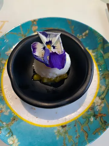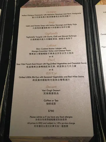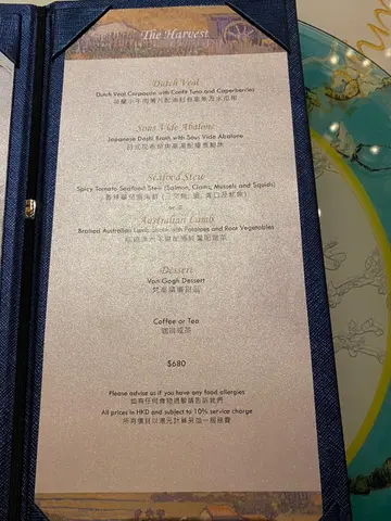 雖然已經結業,但仍然好想為呢一間充滿着藝術感嘅餐廳寫啲最後嘅感受。用餐當日係我同男朋友嘅週年紀念,當時都係店員嘅口中聽到月底結業嘅消息,有啲可惜但亦都慶幸能夠把握最後嘗試嘅機會。餐廳預先send咗Menu俾我哋,由於就嚟結業,所以套餐有七折嘅優惠。餐廳基本上統一上餐時間,同附近枱嘅客人同時享用前菜主菜等。我哋點左The Harvest,食物質素當然高,尤其喜歡前菜:章魚薄片配沙律菜,係我第一次嘗試嘅口感,好清新嘅口感,配埋旁邊綠色嘅醬汁一流!呢個套餐感覺上好似係越食越驚喜,款式多不過每樣嘅份量相對上少,味道正常未到非常特別。更令人驚艷嘅係喺呢一個咁有藝術嘅地方享用晚膳。餐盤印有梵高嘅名作,電子板上亦都播住梵高名作嘅slideshow。希望疫情過後會有更多呢一種藝術型嘅餐廳啦!…查看更多