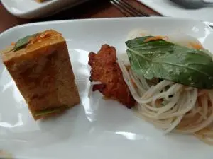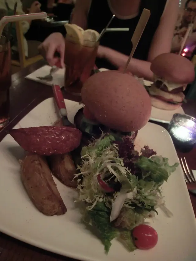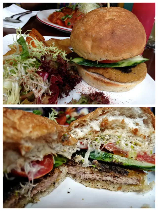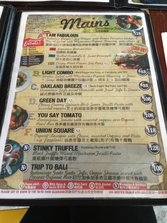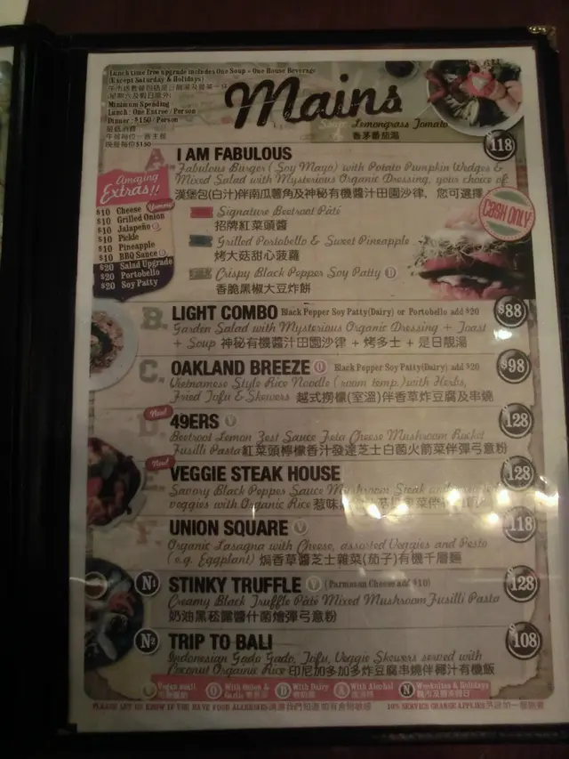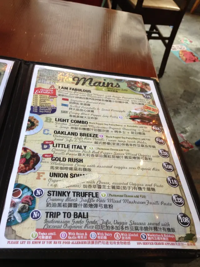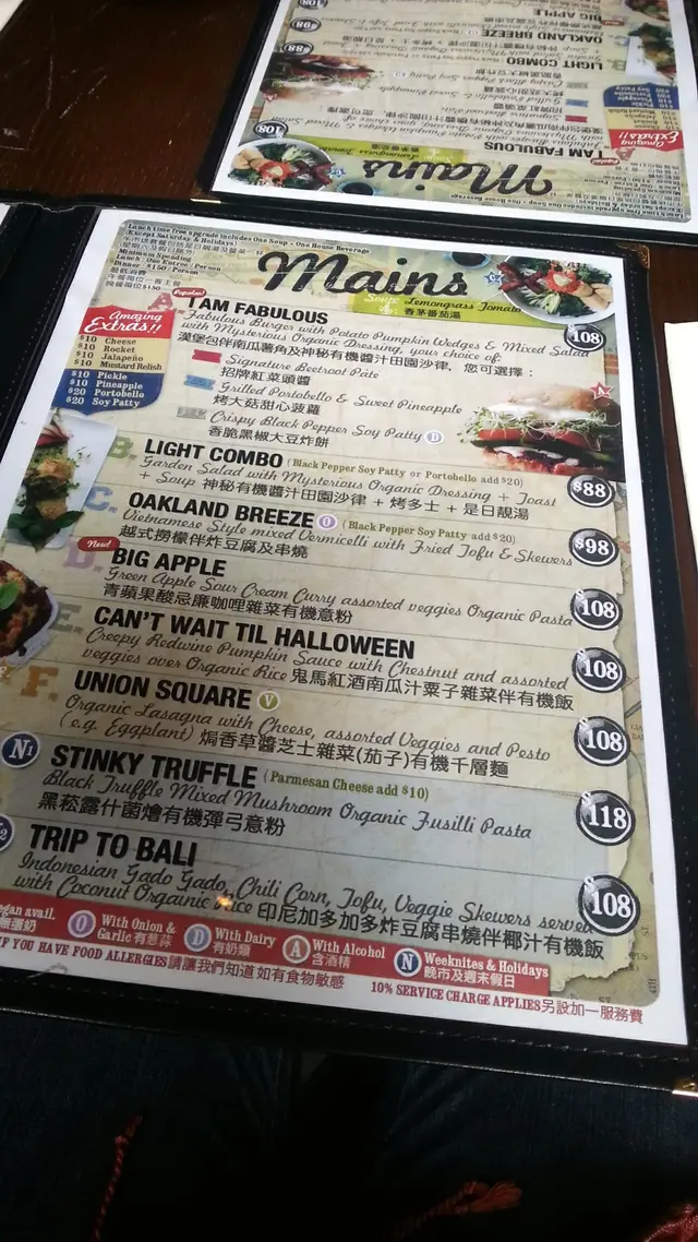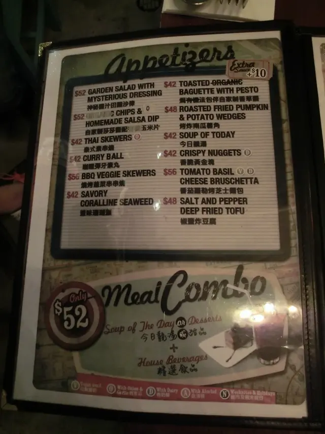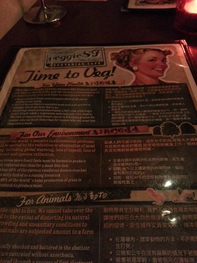 自從朋友在泰國旅行回來以後,就一直嚷著要再嚐那種特色素菜的滋味,也對veggie sf 產生興趣,決定去嚐嚐。星期四的下午,兩時多才到達店內,店內的佈置走vintage風,感覺上所有精品都是店主的收藏品。店內的擺設,海報等很適合拍照。店內走的vintage風跟晀望下去中環的景致產生強烈對比。兩時多到,只有lunch set可以點,我們三個人,就分別點了abc餐一起試。餐湯,西洋菜湯,坦白說,不好喝。 檬粉,dressing味道有點怪。最好吃的只是這個hamburger,roasted pumpkin and potato很好吃!salad, too veggie for me.兩點到,有一位朋友還未到,服務員立刻替我們點餐,也被勸替未到的朋友先點了。食物到了後才告訴我們三點收場,最後我們得把一整份餐外帶,對此十分不滿。價錢尚可,但一半是買環境的。沒有了這樣美的佈置的話,它的食物跟服務不值得這個價錢。…查看更多