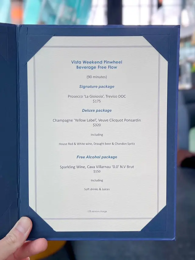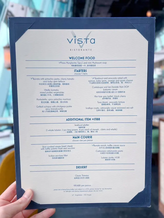 嚟到餐廳真係「嘩」一聲,張張餐枱位置都可以睇到港島區的維港風景,慢慢嘆過週末午餐,正!Vista「週末風車午餐」午餐包括:Margherita Pizza 一片、迷你蘑菇湯(份量都唔迷你)、自選五款開胃菜、主菜及一個甜品。風車午餐的精粹是自選5款開胃菜,選擇了:Burrata 布拉塔芝士沙律、烤八爪魚配鷹嘴豆蓉、迷你鵝肝撻、生帶子薄切、藍鰭吞拿魚配牛油果他他。款款都好食,最鍾意Burrata 布拉塔芝士沙律,份量大,味道都好正宗,有種處於意大利嘅感覺。藍鰭吞拿魚配牛油果他他有啲日本+西式現代fusion,好香滑,如果加多一兩片檸檬在旁,可以自行調配檸檬汁份量,味道會更清新。主菜揀咗:慢煮和牛面頰配松露薯仔蓉及青瓜、西西里海鱸魚柳。慢煮和牛面頰帶點煙靭感,不會很油膩,而且份量也很足夠。松露迷對住松露薯仔蓉咁香松露味,忍唔住不斷食。青瓜🥒原來整咗上面嗰兩塊好似薯片咁脆嘅脆脆片。灑上薄鹽香煎的西西里海鱸魚柳,帶點中式煎魚感覺,配了燴蕃茄雜菜,輕盈不油膩。最後的甜品:經典意大利芝士蛋糕 Classic Tirmaisu,份量都幾大份下。外型都入面的餡餅一點都不馬虎。$488 嘅餐牌食物款式和份量都好豐富。如果加埋海鮮拼盤嘅話,相信要由12點食到3點,唔停咁食足3個鐘😂 價錢同中上環soho 區的西餐廳相約,而呢度仲有海景睇!平時嘅工作壓力、生活壓迫,難得可以慢慢享用美食,欣賞維港風景,放空下,真係好減壓、好寫意。Vista呢間海景餐廳,觀賞維港煙花慶祝活動等風景一絕。臨走前問咗職員,如要預訂觀賞維港煙花慶祝節日的晚餐要幾耐前訂位,職員告知最好於煙花活動前一個月訂位。…查看更多