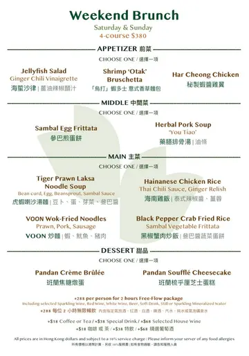 最近在遊客打卡重地旁邊現代新加坡菜 Voon 靜靜地的營業Voon 以摩登時尚的環境跟少量植物打造舒適環境提供各種精緻的 fusion 料理週末 CP 值很高的 HKD$380 4 course 早午餐以更相宜的價錢享受更多不同餐點𓋪「烏打」蝦多士𓋪 秘製蝦醬雞翼前菜有擺盤精緻 外脆內嫩的蝦多士必點的有以秘製蝦醬製作 帶鹹香回甘的炸雞翼兩道前菜雖為鹹點 但都是惹味的涮嘴𓋪 藥膳洋蔥排骨湯𓋪 黑胡椒蟹肉蛋餅與傳統肉骨茶不一樣 排骨湯湯頭清澈帶微微藥膳甘香 入口是蠻清爽的口感在選擇餐點時店員推介了蟹肉蛋餅每口都有鮮甜蟹肉跟黑胡椒小辛香 風味十足𓋪 虎蝦喇沙湯麵𓋪 VOON 炒河粉 喇沙湯麵是油麵和米粉混合的正宗配搭湯底先有濃郁椰奶香氣 後有微微香辣感掛在麵條上 同時感受甜 鹹 辣的豐富層次招牌炒河粉以臘腸 豬肉 蝦作配料惹味醬汁依附著滑溜的河粉上 卻不過於油膩蘸一下辣油更有風味𓋪 斑蘭焦糖燉蛋𓋪 斑蘭梳乎厘芝士蛋糕兩款以斑蘭作主角的甜品各有特色滑嫩的焦糖燉蛋淺淺一層 還是能嚐出濃郁焦香跟斑蘭清香 梳乎厘芝士蛋糕質感輕盈 斑蘭味道也很突出 甜而不膩𓎾 斑蘭青檸特飲𓎾 斑蘭椰子乳酸連甜飲都充滿斑蘭的風情斑蘭草的香柔配酸甜清新青檸 適合夏天品嚐濃郁開胃的椰子乳酸 加上斑蘭 口感更豐富細膩整體是非常高質的 brunch 各款餐點帶傳統風味 又以煥然一新的形象演譯以更親民的風格 重新定義 fine dining…查看更多