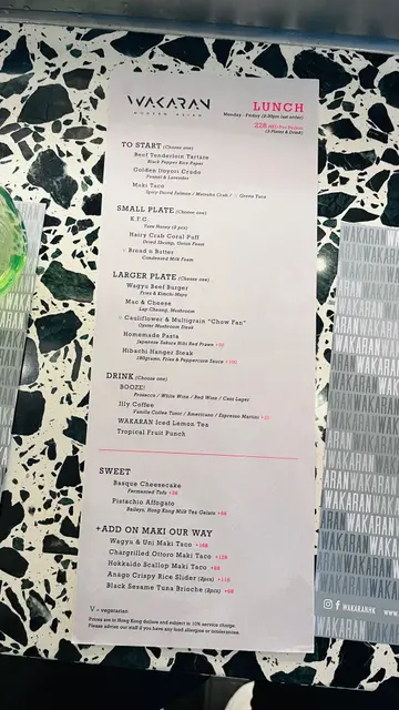 對WAKARAN 呢個名並唔陌生就喺Ship St. 我最愛嘅bakery對面幾乎每個星期都會經過開業年幾當日係初次串門食飽飽再去買包包呢個itinerary我認為相當之好餐廳定位屬fusion bistro最吸引我首先唔係菜式而係個小餐館氛圍就好比著衫Smart casual總比formal dress更顯個性美Open kitchen 坐吧枱可以欣賞到廚房嘅忙碌工作模式煎炒煮炸烤焗一目了然𝘞𝘦𝘦𝘬𝘦𝘯𝘥 𝘣𝘳𝘶𝘯𝘤𝘩 𝘮𝘦𝘯𝘶 𝘛𝘰 𝘴𝘵𝘢𝘳𝘵 / 𝘣𝘳𝘦𝘢𝘥 𝘯 𝘣𝘶𝘵𝘵𝘦𝘳 2.0𝘊𝘰𝘭𝘥 / 𝘉𝘭𝘢𝘤𝘬 𝘴𝘦𝘴𝘢𝘮𝘦 𝘣𝘳𝘪𝘰𝘤𝘩𝘦, 𝘔𝘢𝘬𝘪 𝘛𝘢𝘤𝘰𝘏𝘰𝘵 / 𝘎𝘰𝘭𝘥𝘦𝘯 𝘱𝘳𝘢𝘸𝘯, 𝘒.𝘍.𝘊𝘓𝘢𝘳𝘨𝘦 𝘱𝘭𝘢𝘵𝘦 / 𝘴𝘶𝘤𝘬𝘭𝘪𝘯𝘨 𝘱𝘪𝘨 𝘚𝘸𝘦𝘦𝘵 / 𝘗𝘪𝘴𝘵𝘢𝘤𝘩𝘪𝘰 𝘢𝘧𝘧𝘰𝘨𝘢𝘵𝘰, 𝘉𝘢𝘳𝘲𝘶𝘦 𝘤𝘩𝘦𝘦𝘴𝘦𝘤𝘢𝘬𝘦真心Brunch menu 會令人選擇困難先講麵包原本想吃肉後才回到麵包上但個pandan kaya foam太吸睛麵包dip做到foam version 好輕盈!第一啖就瞬間將成餐飯嘅期望值推高冷葷黒芝麻brioche坦白講麵包嘅黒芝麻味唔算濃重點落喺topping 吞拿魚上吞拿魚顆粒簡單調味再堆成小山成為可愛嘅finger food 相比之下手掌咁大嘅taco 顯得份量驚人炸紫菜內夾住壽司飯同三文魚碎介乎天婦羅與手卷之間熱葷必點係炸雞!本地三黄雞加椰菜花炸到金黃香脆濃郁嘅重慶麻香💯另一道係黃金蝦油泡過嘅炸蝦口感啱啱好夾埋個冇得輸嘅鹹蛋黃主菜點咗招牌嘅烤乳豬望住乳豬上色再慢烤再抹醬汁再回烤繁複嘅烹調工序值回票價一上枱乳豬肉騷香氣濃郁外皮鬆化内裏肉質軟腍當然油份亦不能小覷但呢個happy fat 實在好難抗拒甜品有兩款兩款我都鍾意難分高下一冷一熱巴斯克唔太甜口感紥實至於affogato製作需時等咗頗長嘅時間但見甜品上枱一刻就明晒那並非一般嘅affogato而係近期意大利超紅嘅打卡版本伯爵茶茶香濃厚嘅甜雪做base 再倒入濃縮咖啡再用開情果碎同hazelnut 點綴味道同賣相都誠意十足整體由食物到用餐環境以至服務都滿意中間一段小插曲手殘將個小麵包弄跌到地上店員看到枱面包著嘅小麵包關心地問:「Oh you don’t like the bread?」事實是作為breadie我比在場所有人都更婉惜這失誤😮💨…查看更多