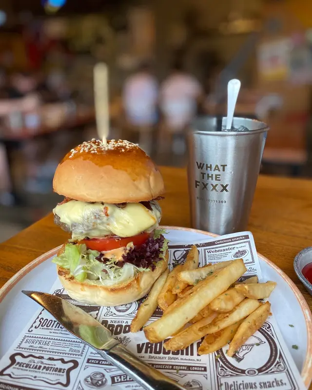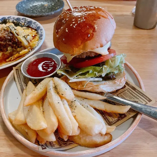 估你唔到新界工廠區落大雨都咁多人,限時90 分鐘無得任坐,不過其實90分鐘都好足夠唔會好趕。良心小店最緊要生意興隆呀!🍔花生醬煙肉漢堡 $92以為佢奇奇怪怪但食落好好味。煙肉🥓煎到啱啱好,唔會硬骨骨;上下層都有花生粒花生醬,但完全唔會突兀!漢堡軟綿綿好Juicy🤤,煙肉同漢堡以外仲配有蕃茄🍅同千島醬沙律菜,消除肉嘅油膩感👍🏻,薯條🍟即炸,香脆可口!大推呀!!!🌚鰻魚蛋包飯 $96飯🍚係珍珠米,有顏色但冇乜味;蛋🥚唔老但冇乜蛋香;鰻魚肥厚,魚骨幼細唔會杉口;紫菜一上枱已經濕晒,好時平時軍艦壽司淋曬嘅紫菜咁😨;整體而言成碟嘢嘅比例都錯晒,滑蛋同飯嘅比例不均,滑蛋過多,濕嘅紫菜又蓋住整條鰻魚,鰻魚汁又痴實曬d 紫菜,想撥走都撥唔到😭。🥤接骨木蘋果梳打、雜果賓治 兩杯都係跟餐+$22工廠區小店都有自己嘅杯,仲要好trendy 添,一d 都唔求奇,無論裝修、佈置、餐具、食物都花左唔少心機,絕對值得你行多幾步走去幫襯!再講多一次個漢堡真係好好食好有驚喜!查看更多