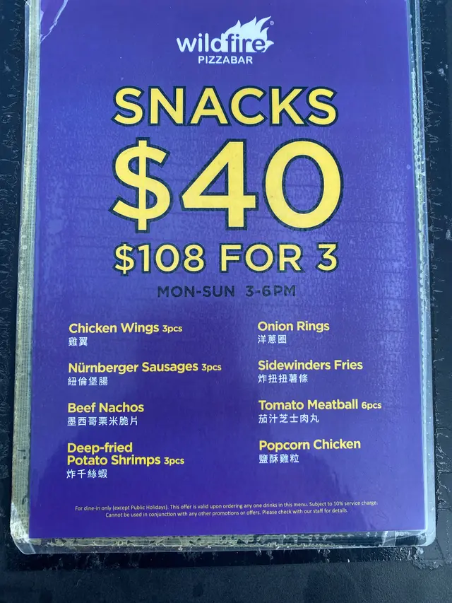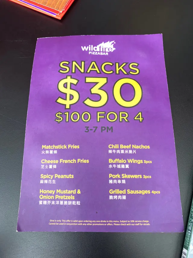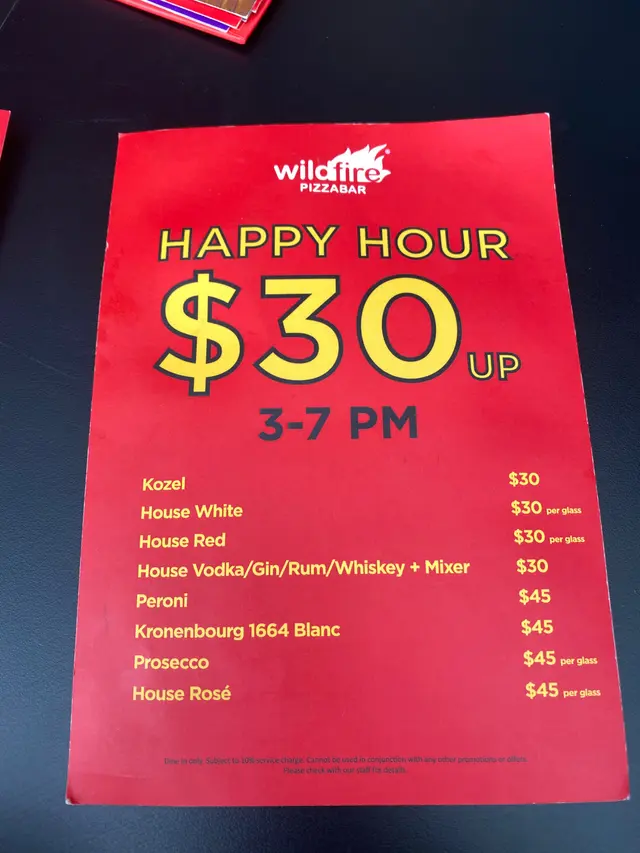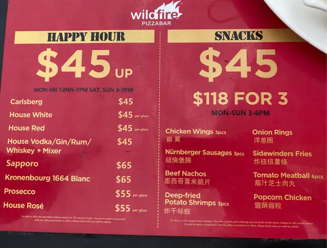 Wildfire Pizzabar (星光大道) (尖沙咀) 網上訂座即賺Rice Dollars 網址: https://s.openrice.com/QrbS0yYs4W0 地址: 香港尖沙咀尖沙咀海旁海濱花園星光大道 電話: +852 22582200