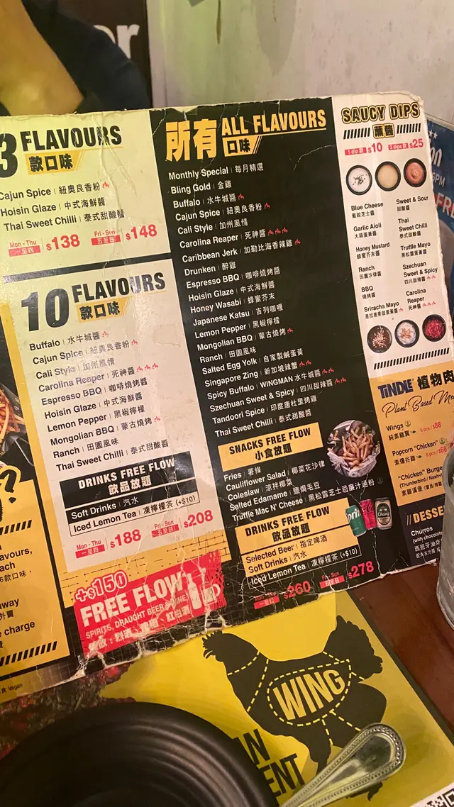 雞翼 應該無人會唔鍾意食😝今次去咗Wingman食雞翼放題 食足90分鐘 有10款口味雞翼同汽水任食任飲🥹愛雞翼人士今次有福了🫶🏻.10種口味任食💁🏻♀️❛ 水牛城醬❛ 紐奧良香粉❛ 加州風情❛ 死神醬❛ 咖啡燒烤醬❛ 中式海鮮醬❛ 黑椒檸檬🍋❛ 蒙古燒烤❛ 田園風味❛ 泰式甜酸醬.每款雞翼都set左係4隻4隻咁 第一round叫左5款即係20隻 水牛城醬好濃 口味偏咸少少 唔會太辣甜辣醬惹味十足田園風味 係sour cream 食落較清新黑椒檸檬第一啖食落有啲酸 刺激味蕾 之後有淡淡黑椒香加州風情有大量芝士🧀咸香味十足全部雞肉都好嫩滑 而且用上歐盟認證走地雞 無激素 亦都不含抗生素👍🏻可以安心食用.第2 round 我地encore水牛城醬再叫左死神醬 咖啡燒烤醬同中式海鮮醬死神醬係真係辣到呀媽都唔認得🤣後勁非常厲害咖啡燒烤醬有淡淡咖啡味 比想像中好食 特別之選中式海鮮醬有蜜糖甜味 配上黑芝麻加葱絲 咸甜交織.一邊食雞翼再飲汽水 真係好chill💕最啱就係同同事黎Happy Friday🥳…查看更多