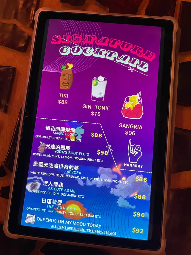 還記得上一次去銅鑼灣的Mamaday是一間色彩繽紛的玩味餐廳,一入門口已被其的特別的裝修所吸引,餐牌上的食物名字也非常特別,令人留下一個深刻的印象。而今次再度光臨,卻是另一番景象。今次的風格已變成一間酒吧形式的餐廳。食客可以大展歌喉,點選自己喜歡的歌曲,一邊品嚐食物一邊欣賞他人的歌曲。而食物方面也有所不同,多了一些佐酒小食和串燒,都幾有風味。🌟三文魚牛油果莎莎三文魚牛油果莎莎配上香脆的蒜蓉包非常美味🌟美國 Prime 牛小排蒜香欖油意粉牛扒切成薄,不會太韌,意粉充滿着蒜香味道,意粉軟硬適中。🌟半熟三文魚意大利飯三文魚煎得半熟令魚的口感不會太過嚡,意大利飯充滿着鮮菌的味道。🌟Vodka熊仔糖這個浸了Vodka的熊仔糖,當然只是大人才可以吃,勝在熊仔糖的勇氣也非常可愛。🌟燒大腸串燒大腸的外面炸得非常香脆,裏面亦清潔得非常乾淨,送走一流。🌟牛肋骨串不過串燒來說,我比較喜歡牛肋骨串,因為口感一流,有點咬口,味道亦比較濃味。🌟白鱔串白鱔肉質非常肥美,燒香料之後非常美味,上面再加點調味令串燒味道更為突出。🌟水果茶水果茶包含非常多的水果,感覺很清新健康,味道不會太甜。🌟荔枝烏龍亦是另外一個非常清新的飲品,荔枝味清新加上烏龍的茶味,適合女士飲用,外表亦非常漂亮。🌟你今日飲左益力多柚子沙冰未啊?兩兄弟就比較喜歡益力多沙冰,因為味道比較香甜,適合夏天飲用。…查看更多