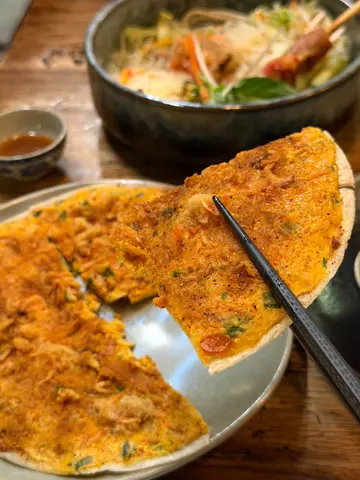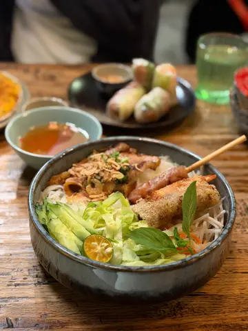 大圍積存街好多好嘢食, 大家都知.但行多幾條街, 冇諗過會搵到間咁有驚喜嘅越南餐廳.一入門口就俾佢嘅裝修吸引住.個feel有啲似酒吧.牆上面有一幅好大嘅越南少女壁畫.餐廳氣氛好舒服.講下食物先.大叻Pizza (HK$88)餅底好薄好脆.剪開嘅時候會有「咔嚓咔嚓」聲.餡料有得揀牛肉或者雞肉, 我揀咗雞肉.Pizza上面仲有蝦米、肉鬆、蔥同埋蛋.食落有啲鹹香味同少少甜.個醬酸酸甜甜, 少少辣.我覺得唔點醬都好食.豬頸肉春卷撈檬 (HK$88)份量都幾多.除咗燒豬頸肉、炸蝦春卷同檬粉, 仲有炭燒豬肉串、勁多生菜同青瓜.個汁酸酸甜甜好開胃.春卷偏鹹, 但咬落好脆.裡面隻蝦好大隻, 仲有啲肉碎.豬頸肉好香, 唔韌.燒豬肉米紙卷 (HK$48)真係有驚喜.米紙皮煙韌.餡料有燒豬肉、檬粉、蘿蔔絲、生菜, 層次豐富.燒豬肉口感結實.點花生醬食, 勁好味!整體嚟講, 呢間餐廳個vibe幾好.坐得好舒服.食物賣相靚, 味道有層次.特別推介米紙卷.我食完仲回味緊.我下一定要試埋其他嘢食!…查看更多