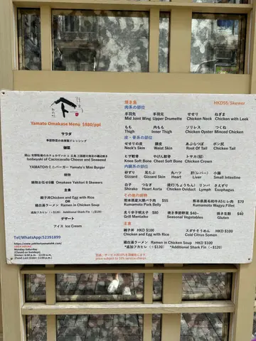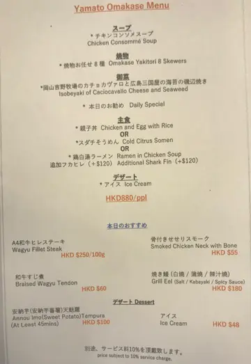 今次試咗嘅dinner omakase,菜式豐富如下。令我驚喜嘅係配燒鳥嘅醬汁,非常特別!印象最深刻係煙薰雞頸肉,煙薰味好香!第一次食雞頸肉,估唔到都幾多肉😲另外,餐廳自家製嘅雞湯非常清,無腥味,微微帶胡椒味,暖胃👍🏻菜單前菜:北海道海膽天婦羅及長腳蟹牛油果他他沙律:日本椰菜沙律配炸牛蒡雞湯10串廚師發板燒物(唔小心食多咗串):1. 燒雞胸肉配鮮生葵醬及紫蘇花2. 燒雞腿肉配腐乳麻油蔥醬3. 燒雞髀肉配柚子胡椒4. 麻油燒雞中翼5. 燒野菜6. 煙薰雞頸肉7. 燒雞皮配八角粉及藍芝士8. 燒雞胸軟骨9. 白皮串🐷10. 燒雞髀肉拉京蔥青椒11. 燒雞肉丸御菜:1. 海苔卷岡山吉野牧場燒芝士2. 迷你燒汁雞肉漢堡3. 炸蕃薯球4. 松茸帆立貝茶碗蒸主食:親子丼 / 雞白湯拉麵甜品:日本水果配中結餅雪糕P.S. 由於唔食內臟及牛,師傅就無準備到內臟燒鳥及牛俾我,如果大家鍾意食雞內臟,Yamato嘅選擇都幾多,例如有雞心、雞白子、提燈、淋巴、食道等等。…查看更多