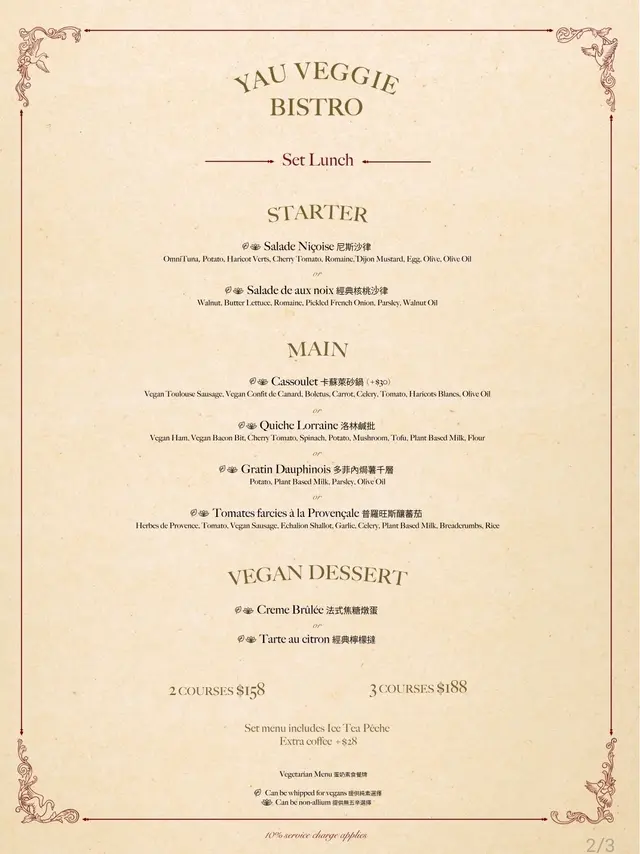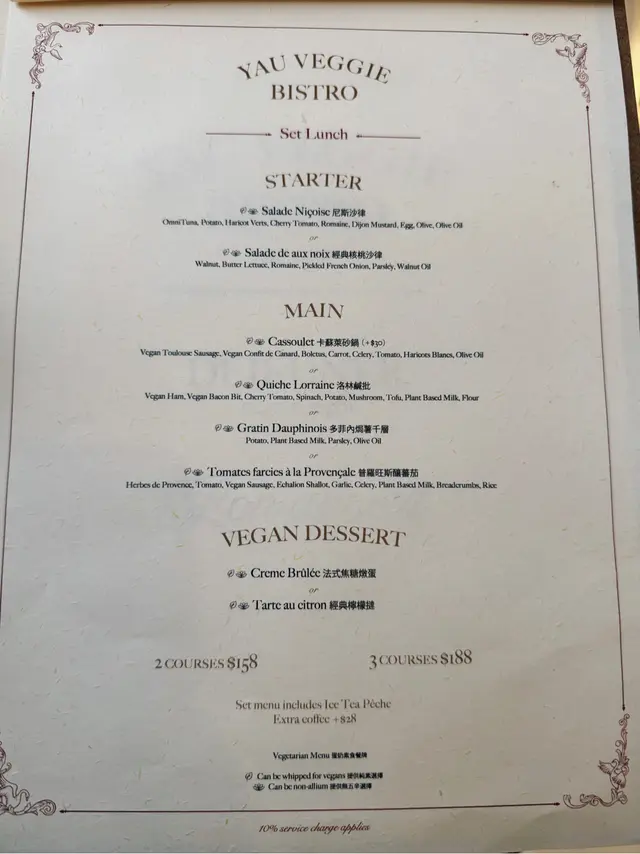 🌿用素食神還原法國料理嘅美味,令食肉獸都會愛上嘅素食法國料理餐館🇫🇷屋企人生日想食素,收藏咗好耐嘅Yau Veggie終於出場喇🤎🔸威靈頓牛柳🐮最令人期待嘅主菜 — 威靈頓牛柳!由不可能牛肉製成嘅威靈頓,金黃酥皮外層下包住煙肉、蘑菇醬、仲用紅菜頭汁為牛柳天然地上色👍🏻 唔食牛肉嘅屋企人話無諗過自己有機會食到威靈頓牛柳😆 還原度十分高!🔸尼斯沙律🥗爽脆羅馬生菜、梨肉、新吞拿魚肉、雞蛋,簡單清新🥬🔸韃靼牛肉🐮 平時唔鍾意食生牛肉,呢個菜式俾到驚喜🤩脆卜卜法包配滑溜溜牛肉他他,估唔到又幾好食。🔸香煎鵝肝配焦糖蘋果🍎唔講以為自己食緊真鵝肝多士,甚至比真鵝肝更好食!😍鵝肝嘅真身係菇菌同果仁,味道神還原之餘仲冇真鵝肝咁肥膩。香脆多士配埋甜甜酸酸嘅蘋果醬,好出色😋🔸香煎鵝肝配黑醋無花果🤎同樣係鵝肝多士,換上較濃厚嘅黑醋無花果醬汁,令整體味道更有層次感😋🔸帕門蒂爾餡批🥔滿佈麵包糠下嘅係一層薯蓉,好香滑。底層係植物肉碎同蔬菜粒,簡單溫暖嘅味道。🔸法式紙包魚🐟紙包魚將嘅食材嘅水分保留返響食材本身,濕潤而保持原味同充滿檸檬香氣。🔸齊米諾魷魚🦑好有驚喜嘅菜式!口感同真魷魚嘅彈性係一模一樣😲 好香牛油香草味嘅菜式🧈🔸白醬小牛肉🐮濃厚嘅白醬配柔軟嘅小牛肉,配埋法包食唔錯👍🏻🔸寶雲酥羊架 🐑無諗過連寶雲酥羊架都做到咁似,用竹蔗乾嚟做羊嘅支架😆 羊肉調味偏重,外層做得酥脆。反而喜歡下面嘅薯蓉,好幼滑😋🔸蒙布朗🤎屋企人生日叫咗個甜品,簡單美味嘅結尾☺️整間法式餐館感覺復古優雅,同時好溫馨☺️ 屋企人生日,廚師出嚟傾咗幾句,餐廳團隊好年輕而且好有心思去還原每一道法國菜。幾乎每一道菜都俾到驚喜,食肉獸嚟過呢到絕對會對素食改觀🤭 🐾貓奴足跡🐾🌐Yau Veggie Bistro (荃灣)📍荃灣白田壩街45號南豐紗廠1樓118號舖…查看更多