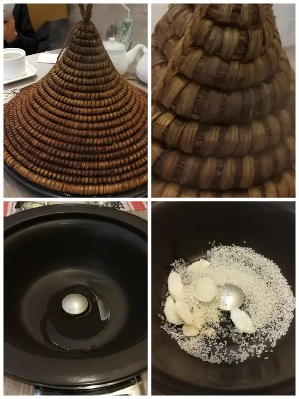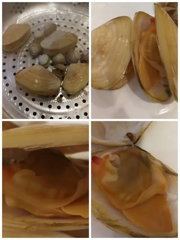 [金玉良緣、羞籠紅麝串、倚床繡鴛鴦] 一隻隻脹卜卜的 大貝殼、小貝殼, 猶如鴛鴦戲水般 ,在石蒸鍋裡面翻滾。 不消四分鐘 ,已經面紅如胭脂 , 秀色可餐。。。