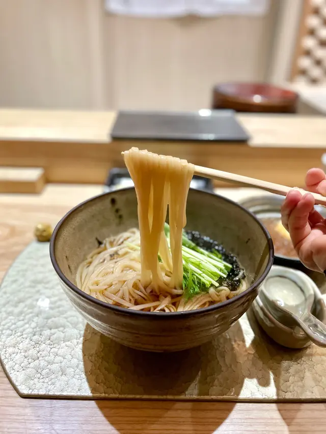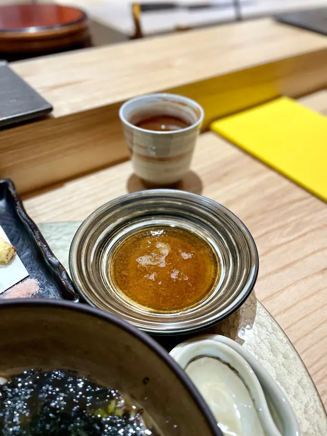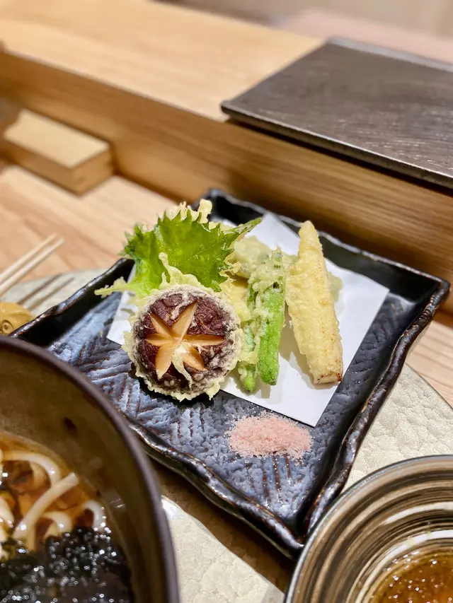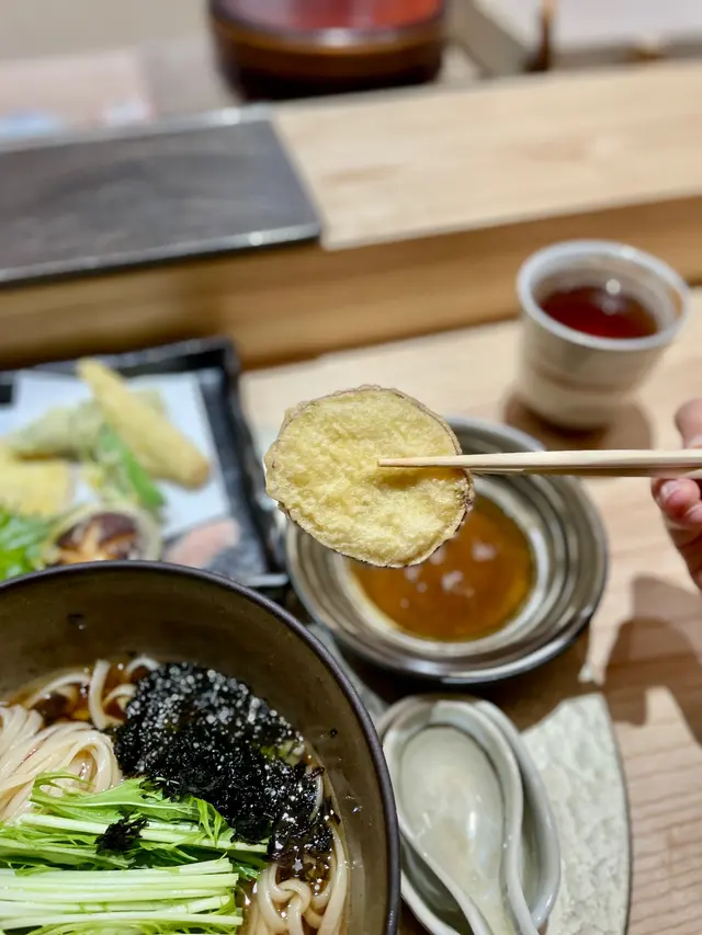 天婦羅分別有秋葵、粟米、番薯、青椒,點上蘿蔔蓉。烏冬係扁扁地嘅款式,好滑身!配上鰹魚湯底同紫菜,豐富又健康。