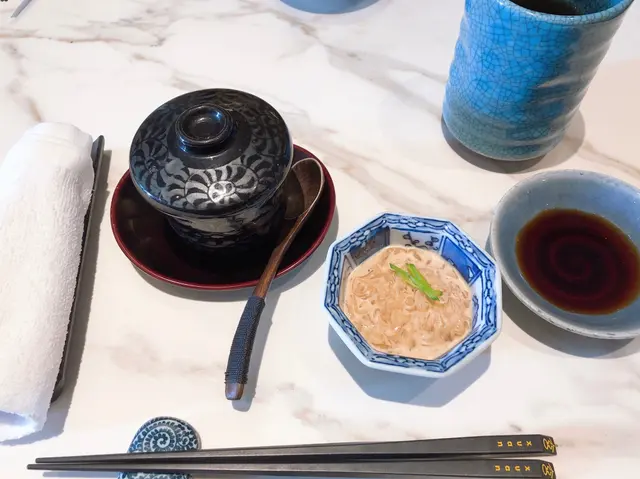 由於我們是Lunch Set 的關係,所以每一個Set 都配有前菜,分別就是麻醬海蜇和茶碗蒸。單是前菜,已經讓人非常入味。冰爽的海蜇配上麻醬,令人十分開胃;暖熱的茶碗蒸則很滑溜,為稍後的主角奠下基礎。