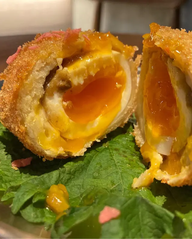 外皮炸得金黃脆脆又唔會好油、切開溏心蛋仲係流心架,蛋同皮之間有少少咖喱豬肉醬,配合埋好特別好好味😋