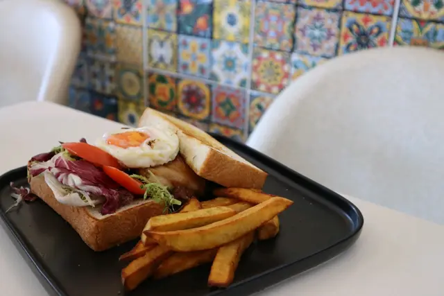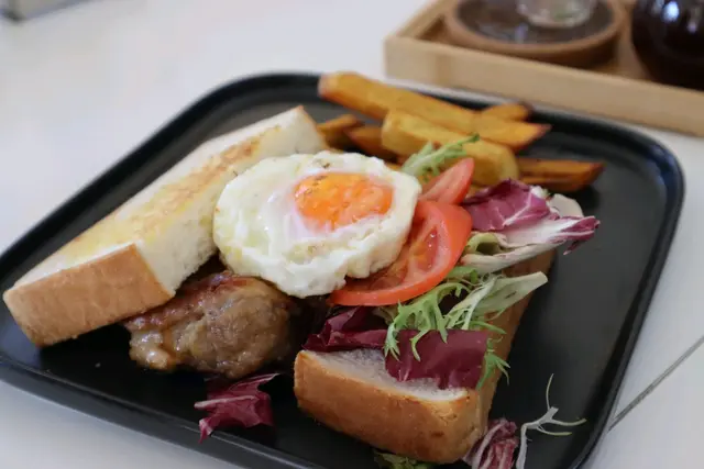 [照燒雞扒剪蛋三文治配炸地瓜條]