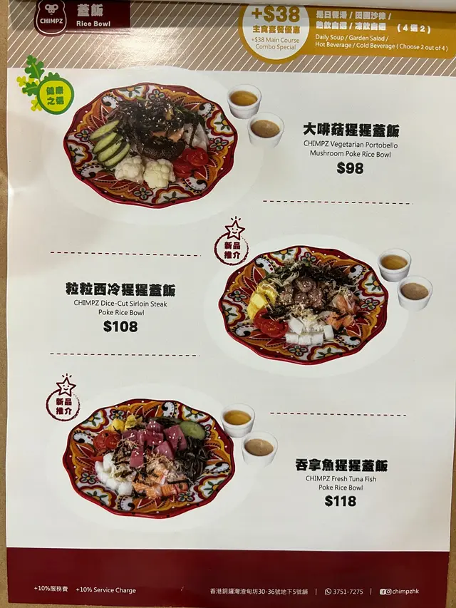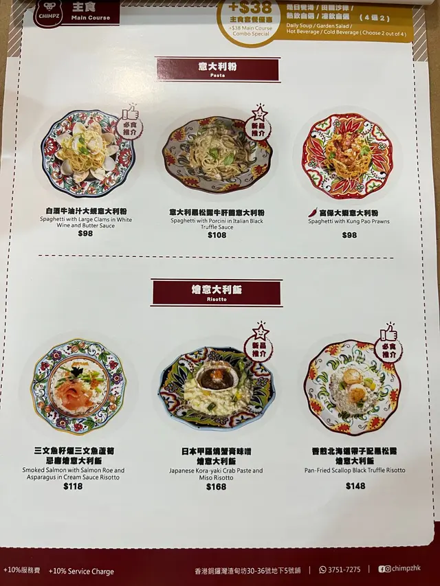 主菜可以以$38加配套餐,可以在〔是日餐湯、田園沙律、熱飲、凍飲〕裡四選二