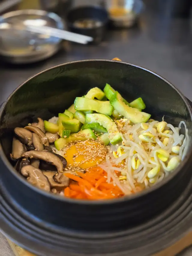 醬腌牛肋條一放落就猛火快炒,好快就熟咗,食落有咬口得黎幾有甜香,野菜拌飯份量都幾大,味道唔會太重辣同鹹,配上惹味燒肉就最正🍚
