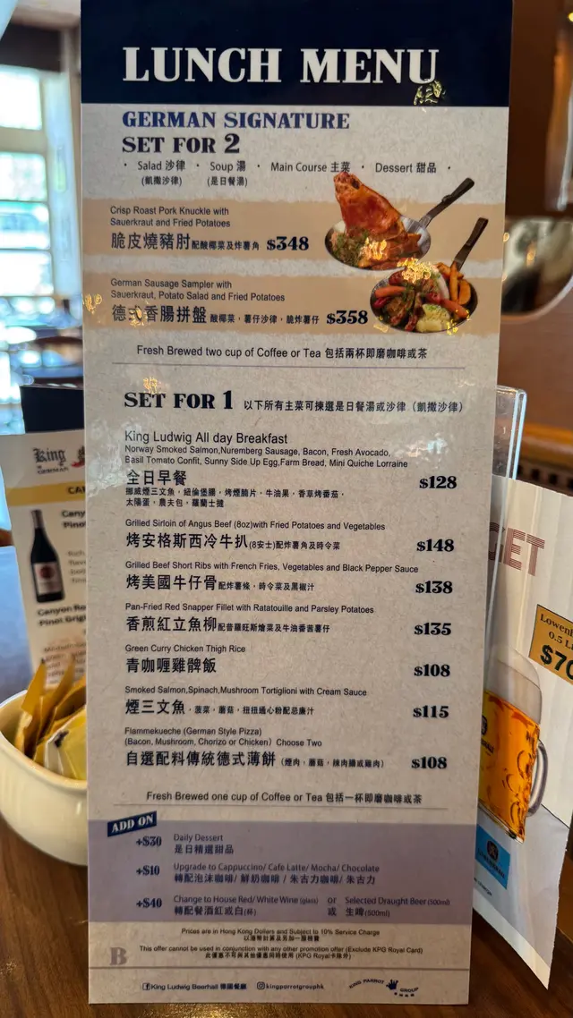 呢度有 多款 一人套餐 同埋 兩款 German Signature Set For 2,包「Salad 沙律・Soup 湯・Main Course 主菜・Dessert 甜品」,咁食咗 $348 脆皮燒豬肘配酸椰菜及炸薯角 Crispy Roasted Pork Knuckle with Sauerkraut and Fried Potatoes