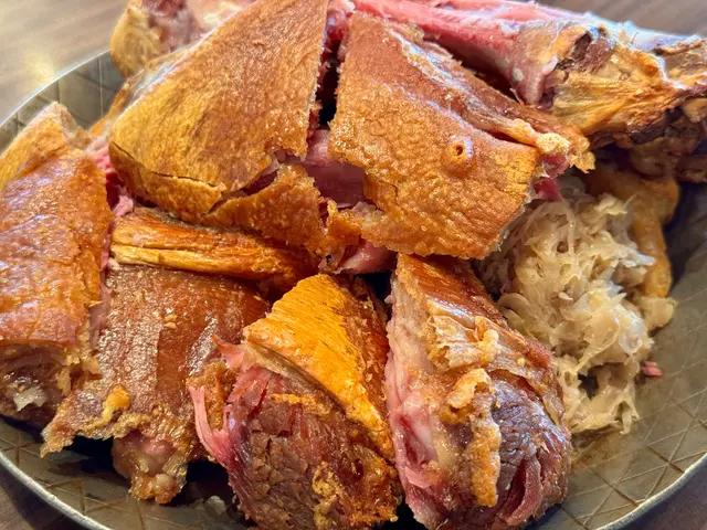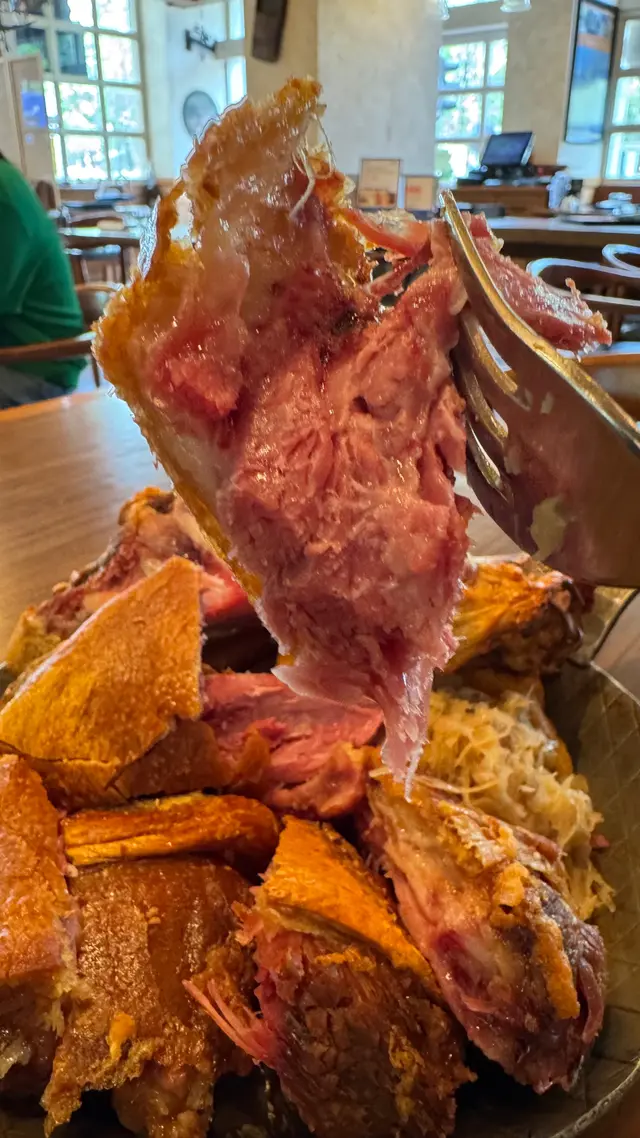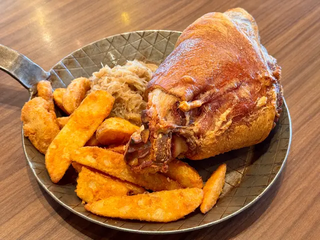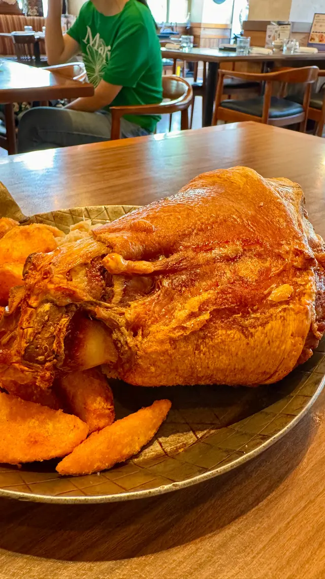 「脆皮燒豬肘配酸椰菜及炸薯角」:豬手皮燒到脆卜卜,似乎大部份油份都已經燒咗出嚟所以唔覺好肥🤣,豬手好味道肉質軟熟又唔會太鹹(坊間太多餐廳燒豬手味道太鹹),呢個「燒豬手」係高質素作品🤣