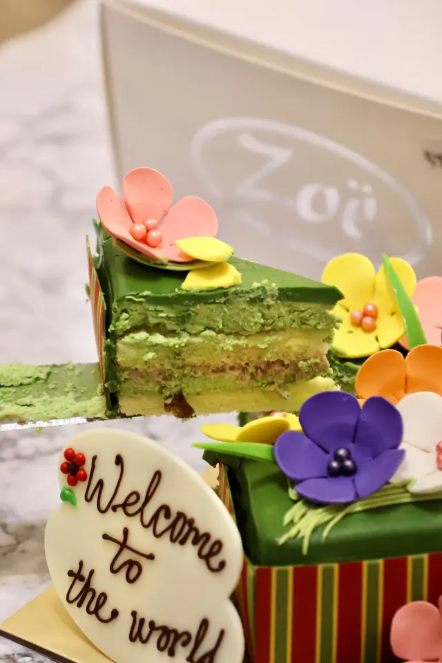 -Green tea cream with red beans and biscuit base decorated with chocolate flowers