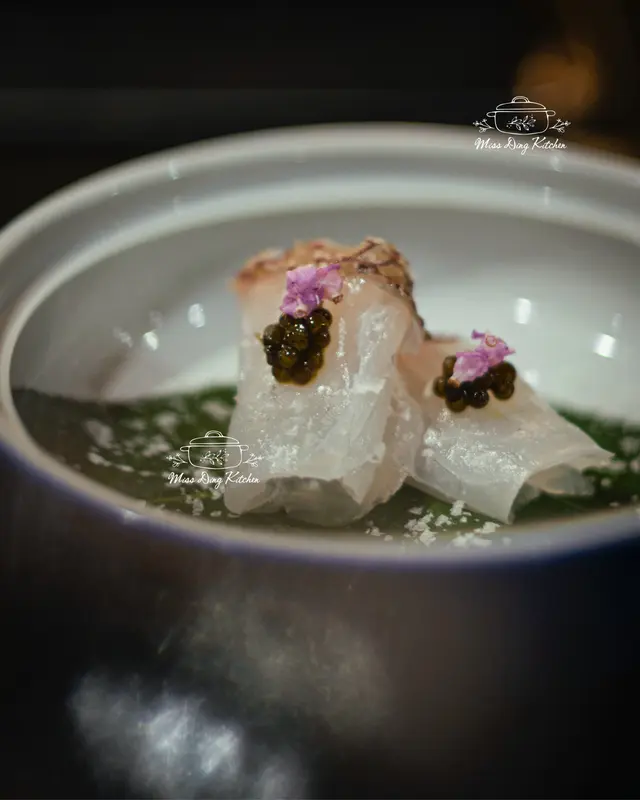 肉質爽口帶嚼勁,搭配魚子醬、紫蘇花及淡雪鹽,散發淡淡甘甜、鮮美。