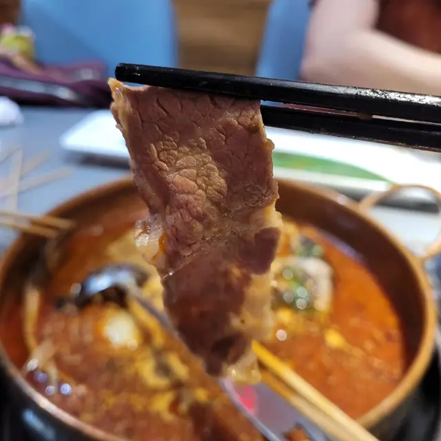 安格斯牛肩胛油花和瘦肉的比例恰到好處,燙成粉嫩色時即可享用安格斯牛肩胛。安格斯牛肩胛吃起來彈嫩,不用過多的調味,單吃已美味,讓人一次涮上好幾片安格斯牛肩胛也不會覺得過膩,對於喜歡吃牛肩胛的朋友來說,這一大片的安格斯牛肩胛入口令人大大滿足。