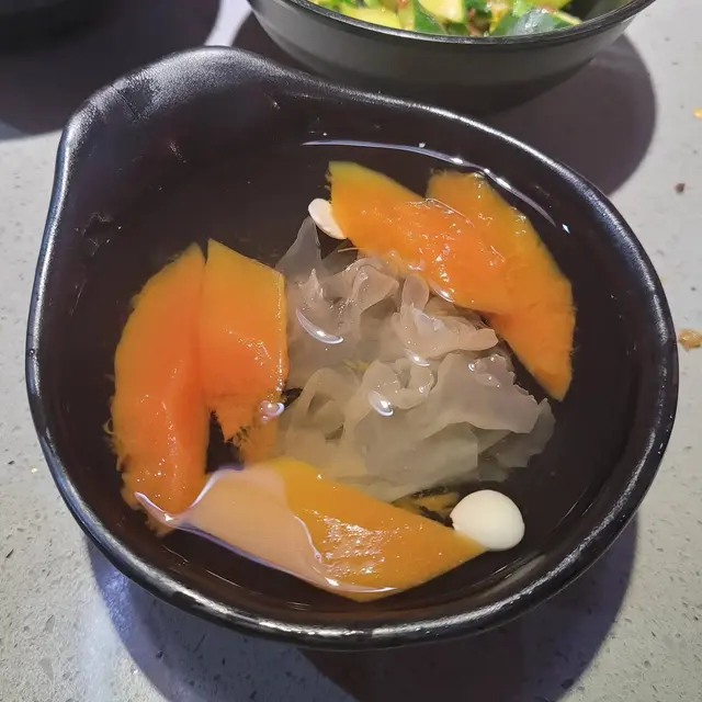 我猜城南香廚的糖水會不定期更換,是晚的糖水有木瓜雪耳糖水,糖水裡頭滿滿雪耳與木瓜,雪耳滑溜溜的,木瓜煮到軟綿好入口,喝起來不會太甜,卻滋潤無比,吃完烤魚火鍋喝最適合不過。若想來點天然的清甜,可以吃點清潤多汁的西瓜,透心涼一番。