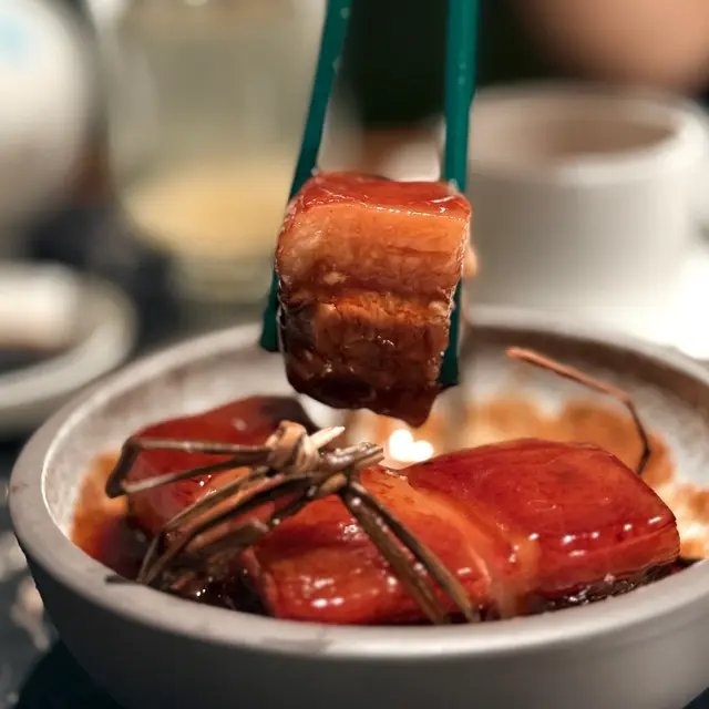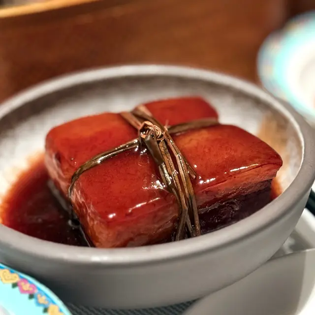 以馬蓮草捆紮的方肉燉到用筷尖輕撥即散,肥脂化作透明凝膠層。特別欣賞底部鋪墊的蓑衣黃瓜,脆嫩解膩,可見搭配邏輯的周全。