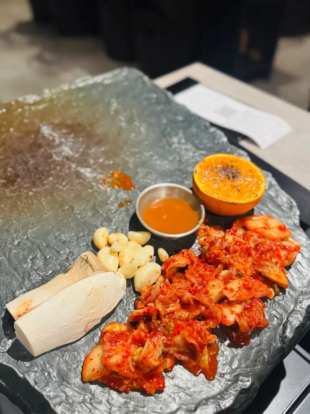 石板燒出嚟嘅焦香效果一流!簡單蘸少少鹽同蒜頭🧄一齊食已經好正~不過五花肉可能仲正😝。
