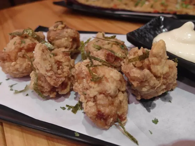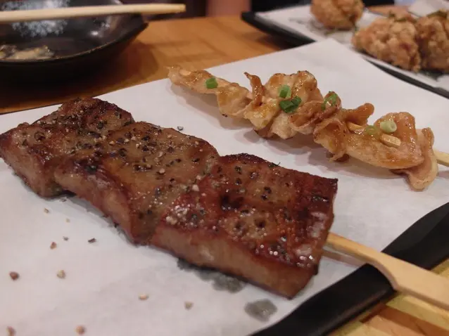 雖然Venus唔食牛肉,但細佬係牛魔王,叫咗串鹽燒厚切牛舌心同椒鹽炸雞皮比佢試下,佢話牛肉好厚好多汁,炸雞皮凍咗食有d硬