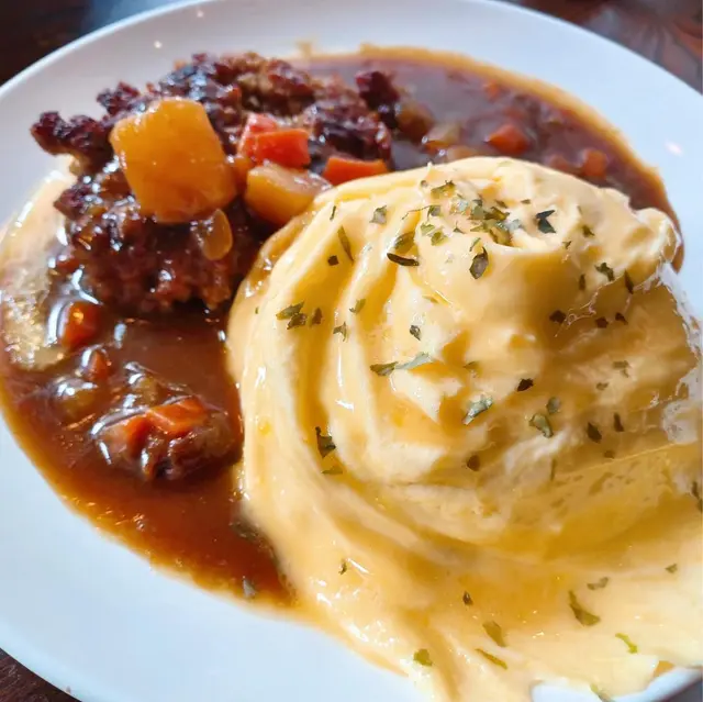 蛋包飯仲可以揀豬扒、雞扒、或者魚柳🐟醬汁可以揀白汁/燒汁/咖喱汁,私心推介咖喱汁配蛋包飯,入面仲有啲蘿蔔同薯仔粒🥔好夾! 蛋包飯係曾經好紅既旋風蛋,蛋汁比例剛剛好,自家製漢堡扒好厚身,半煎炸好香口,外層有微微焦香🐷肉質帶粒粒口感🤤飯有大概一碗飯量,份量好充足🍚