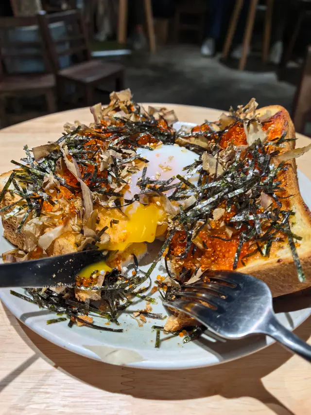必點!🔥烤得香脆嘅多士,鋪滿濃厚嘅明太子醬,一劃開溫泉蛋,蛋汁同明太子撈埋一齊,口感Creamy又鮮味,真係邪惡到不得了!