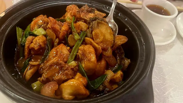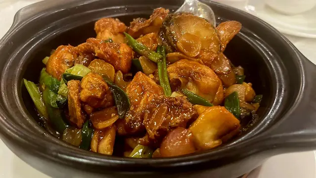 揭開煲蓋瞬間,濃郁香氣撲面而來,是經典粵式炆煲令人沉醉的訊號。鮑魚炆得軟糯適中,邊緣微微收緊,吸收了雞肉的精華與醬油的醇厚,入口嚼勁與鮮味並存。雞肉選料上乘,經慢火炆煮仍保持滑嫩,醬汁徹底滲入纖理,鹹鮮中帶有淡淡蠔油甘甜。整體調味克制,旨在突顯食材本味,佐飯尤其相宜。