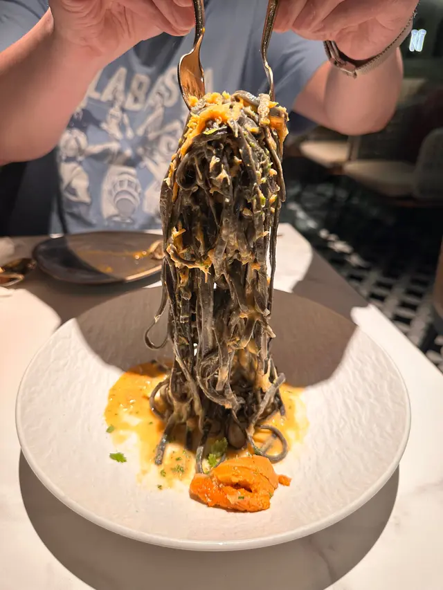 扁意粉用了墨汁製成,麵質煮得剛剛好,海膽、蟹肉及醬汁都鋪在意粉上,海膽入口即溶質素不錯,撈勻後意粉掛上了不少醬汁及蟹肉,醬汁濃稠入口口感滑順。
