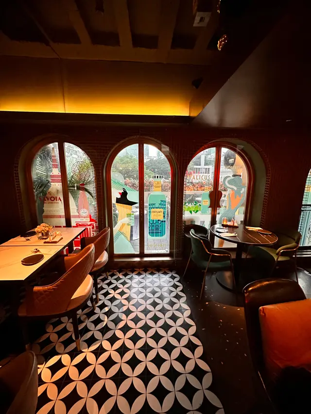 進入餐廳先要經過一條金光閃閃的隧道,店內裝潢很摩登型格,餐廳以綠色為主調,柔和的燈光襯托下,充滿了浪漫的氛圍,店內有酒吧及室外露天座位,室外區更可以飽覽絕美白色的清真寺,清真寺的景觀充滿異國風情,令人彷如置身在外地旅遊的感覺,可以說是絕對不容錯過的打卡秘景,餐廳亦有供應西式多國菜及外形別緻的酒類飲品,而地點鄰近港鐵站,感覺亦是一個很適合放工後,放鬆身心的好地方。
