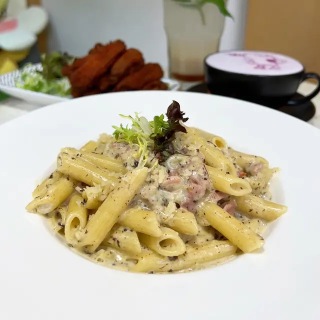 「卡邦尼蛋汁長通粉(加黑松露醬)」醬汁超濃稠,滿滿的芝士和忌廉香,口感creamy,長通粉口感煙韌,筆管型麵條釀入芝士及黑松露,味道別具層次,裡面的洋蔥🧅和野菌蓉更提升松露香,亦亦不會被香濃的忌廉掩蓋☺️ 加上煙肉碎更香口,吃完也不覺得膩🥓 這道菜值得推介,又是另一道小編喜愛的忌廉汁菜式😎