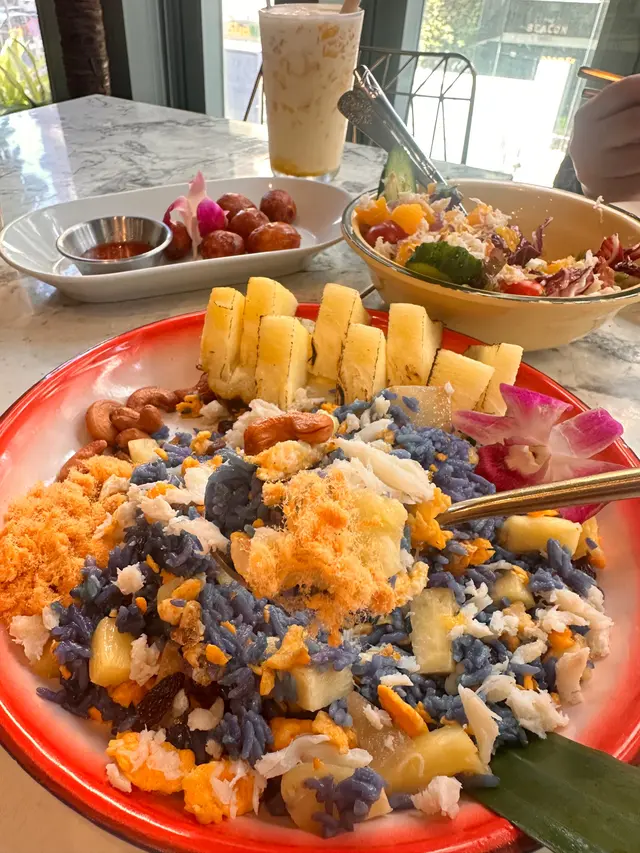 藍蝶豆花炒飯內有一瓣瓣蟹肉、提子乾、菠蘿、肉鬆及腰果,口感豐富,藍紫色的飯顏色特別,而且粒粒炒得分明入口煙韌,伴碟有酸甜的菠蘿肉吃,很開胃。