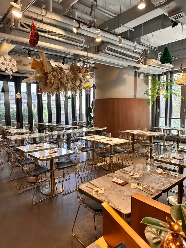 店內裝潢採用了自然柔和的色系作主調,室內放了花花草草作裝飾,而且已經有不少聖誕裝飾,室內有一排落地玻璃,感覺開揚舒適,而室外草地位置亦有不少座位給客人享用,儼如鬧市中的綠洲,感覺是很適合同朋友聚餐及打卡。
