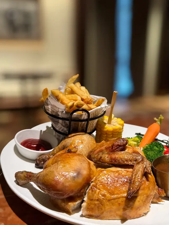 烤雞焗至金黃色澤,外皮酥脆,肉質軟嫩多汁,配上香蒜迷迭香醬汁更惹味,配菜有即炸嘅粗薯條,口感香脆,另外有烤番茄同埋西蘭花,味道清新。