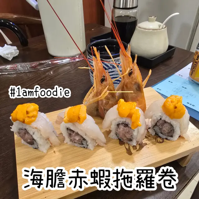 之後 $32 嘅「汁燒帶子」壽司佢都有食,係另外都係 $32 嘅「油甘魚腩」壽司佢冇食啫,兩者我都覺得係唔錯嘅。而我冇食嘅赤蝦,我就叫咗 $88 嘅「海膽赤蝦拖羅卷」代替。估唔到都幾好食,幾有驚喜,呢三款嘢本身都邪惡,夾埋一齊食有種化學作用。
