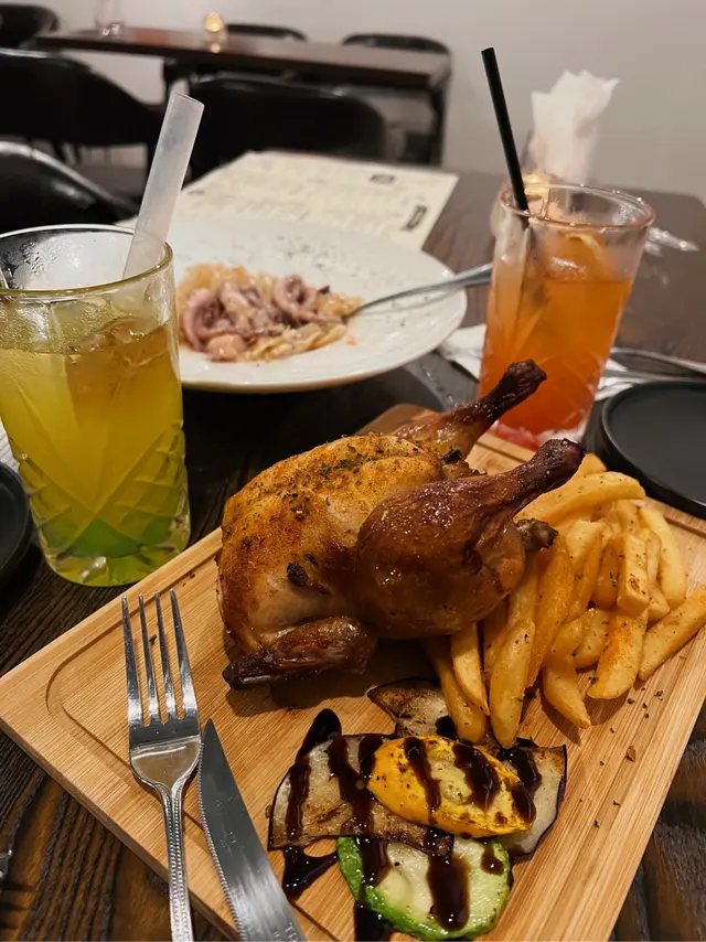 原隻燒春雞見到已經好吸引😛,火候剛剛好,一啲都唔乾,外脆內香,調味亦恰到好處,唔會搶左雞肉本身嘅鮮味👍🏻,側邊仲有粗薯同烤時蔬伴碟