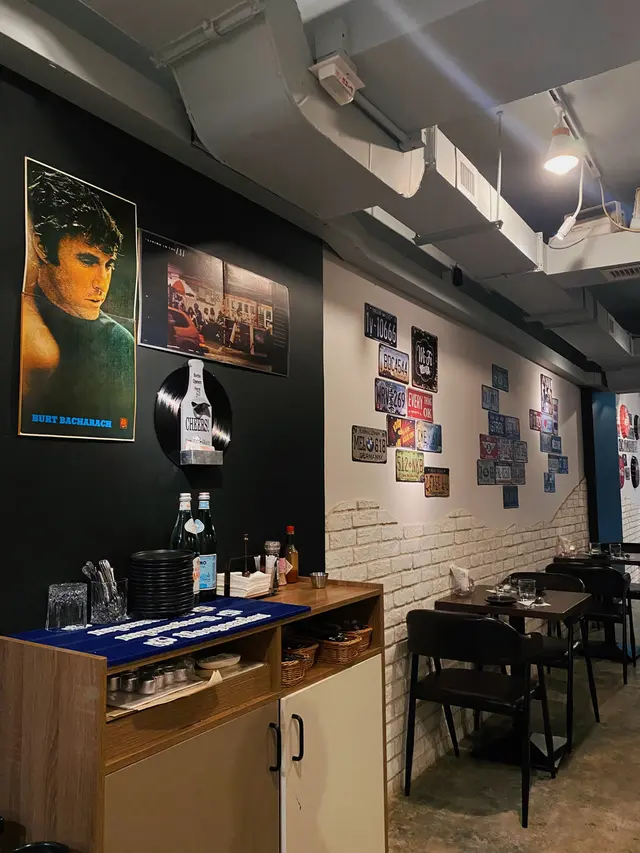 環境:行美式工業風,牆上掛咗唔少黑膠唱片💽,復古車牌,另一面有幅壁畫,充滿藝術氣息