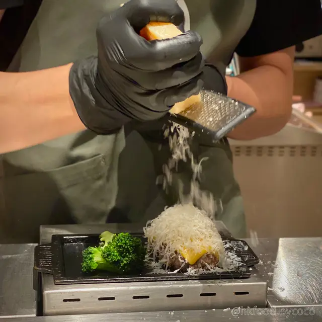 漢堡上鋪有車打芝士,煎到半溶嘅時候,店員會再即場刨上芝士絲,賣相吸引,可以等到半溶再食,小妹個人會將部份芝士撈埋西蘭花一齊食,更滋味