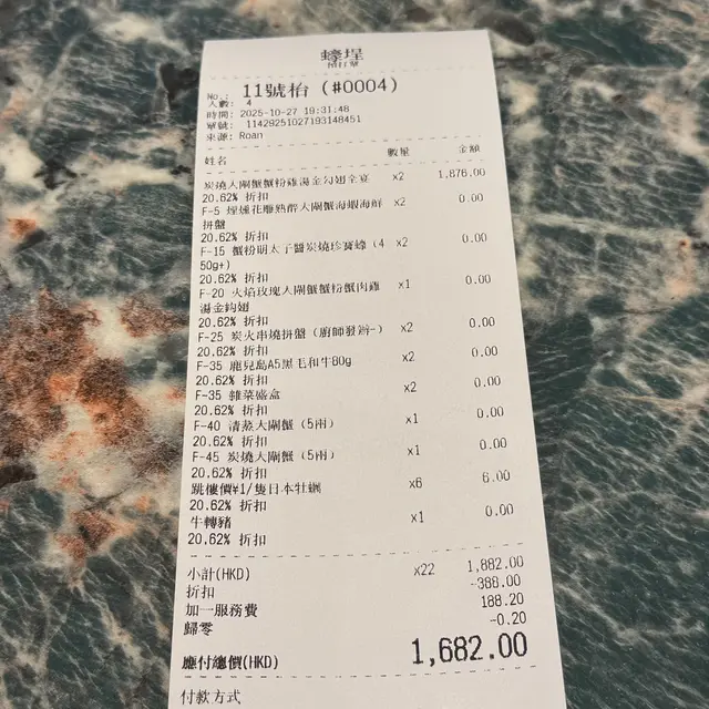 一上枱煙霧瀰漫,儀式感十足。花雕熟醉大閘蟹同埋海蝦酒香濃郁,大閘蟹蟹膏濃郁甘香,生蠔帶有海水鮮味,每款海鮮都鮮味十足。