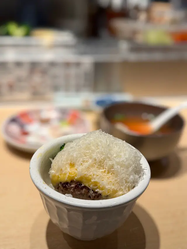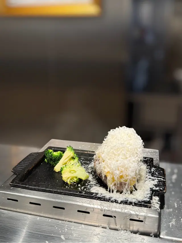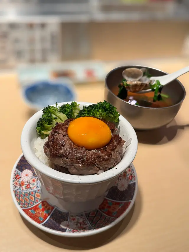 選用九州黑毛和牛同埋美國牛肉混合製成,口感非常細膩,肉質鮮嫩多汁,表面煎至焦香,如果想再熟啲可以自己喺鐵板上再煎一煎。套餐附送日本生食用鮮醬油雞蛋,可以製作成美味嘅生蛋拌飯,蛋汁肉汁滲透每一粒米飯,好美味。