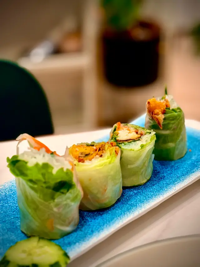 米紙卷正!軟殼蟹炸得外脆內嫩,搭配新鮮的生菜同香草,咬落去有清新感